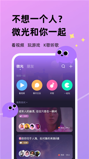 微光app安卓版是一款专门为异地朋友而准备的聊天软件。在微光app安卓版里用户可以叫上自己异地的好朋友,也可以通过匹配路人的方式一起看电视综艺,里面的资源特别多。像高中毕业后各奔东西的高中同学啊,从小一起长大但是却不在同一座城市发展的好闺蜜啊都特别适合用这款软件。你们可以一起边看电视剧综艺,一边在公屏上打字聊天。不仅如此当你有多个好朋友相约一起看某部影视时还可以开可以容纳20个人的多人。房间若是在饭点的时候追剧也可以用麦上打电话的方式一起聊天好不快活。而且软件内资源更新的速度超级快,有的时候你甚至都能在不知道看什么的情况下快速的找到最新出的资源!还可以通过从其他软件投屏进来的方式看电视哦!了解更多软件信息,就赶紧下载体验吧! =