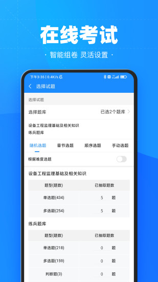 选择需要测试的考试科目(题库内容),设置练习的题型和分数以及考试时间,系统可以高效的随机组卷进行真实的考试模拟,支持判分,可以有效的帮助您巩固学习成果,提升学习效率.