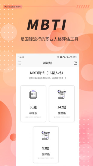 mbti职业性格测试app免费版是一款非常不错的职业人格测试评估软件,这款软件为用户提供了非常优质的测试服务,基于国际流行的性格测试,由专业人员提供了多种人格分类,用户可以通过测试来更好的了解自己的人格。mbti职业性格测试app免费版拥有多种题库等你来选择,用户需要根据自己的真实性格来填写相对应的选项,软件会根据用户的选项来进行综合评估。mbti职业性格测试app免费版可以免费查看测试的内容,拥有详细的分析让用户可以更好的了解自己,发现一个不一样的自己,喜欢的话千万不要错过,感兴趣的用户快来下载体验。