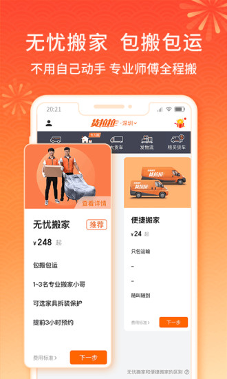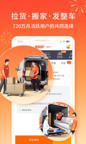 货拉拉2021最新版是一款超多人都在用的优质线上货运服务软件app,该软件为广大需要搬家拉货的用户们提供了很大的帮助,软件能够为用户们提供最优质且可靠的货运服务,而且各个地区都有货拉拉的专业货运司机,每位司机都是通过专业培训上岗的,如果你有需要可以再平台上线上订单,软件就会为你精选的为你推荐适合你的货运司机,覆盖面超级广,不管是同城拉货,上门搬家,还是商品配送等等超多业务服务都有,为用户们提供了一站式的优质货运服务,有需要的小伙伴就别在犹豫了,快来点击下载货拉拉2021最新版使用吧。