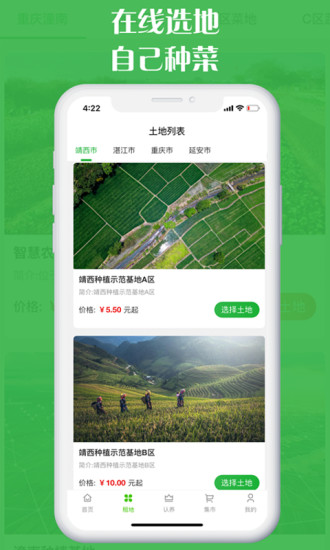 【租地种植】选择一块土地租下并购买种子>选择配送周期>开始种植,实时监控实时查看、远程控制浇水施肥,即可开始自己的私家菜园;种植成熟配送到家。【农业认养】选择果树并租下>选择配送周期>开始认养,实时监控实时查看,即可开始体验私家果园;果树成熟以后配送到家