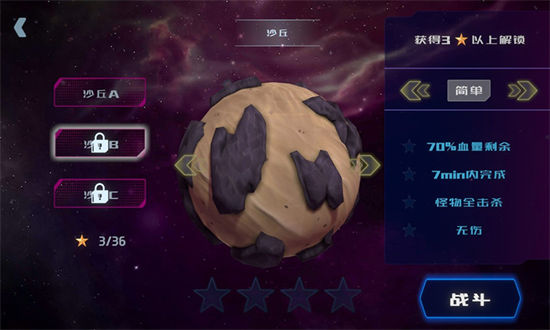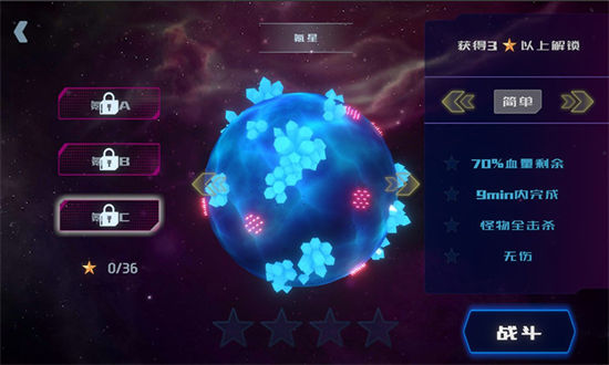 1、丰富的星球可以选择来进行探索,每个星球都有不同的战斗关卡等你来挑战。