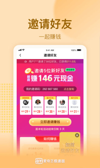 爱奇艺极速版下载2021安卓最新版在国内备受大家的喜爱,只需要一键登录到爱奇艺极速版下载2021安卓最新版中,随时随地都能查看到国内外推出过的所有影视作品,无论是影视大片还是连续剧集,只要是你感兴趣的作品都是会及时更新上来的,这里提供的资源更新速度是非常快的,只要有新片新剧推出后,大家都能第一时间在这里点播收看到,可以不充值会员,精彩作品依旧是可以免费观看的,只要是无聊的时候都能借助这些优秀作品为你排忧解闷呢。本款软件最大的特点就是提供了众多赚钱任务,无论是完成签到任务还是看看视频,完成后都是可以领取到现金红包奖励的,可以将周边朋友以及家人也邀请进来,一口气就能领取到大额经理呢。每种影视题材都有对应的频道进行整理分类,从中搜索找片的话花费的时间都不会多呢。