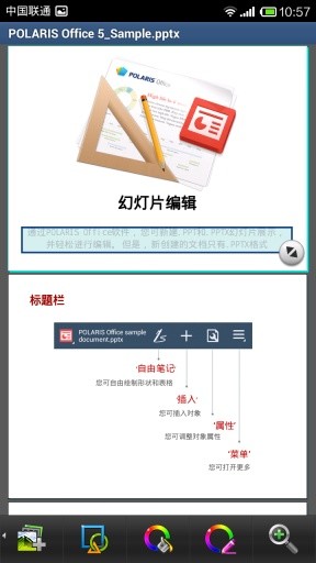 Polaris办公工具是一款智能移动互联网办公软件,用户通过Polaris办公工具可以直接进行幻灯片、和工作内容的编辑制作。Polaris办公工具提供智能幻灯片编辑功能,用户只需要上传图片即可生成幻灯片,同时,Polaris办公工具还支持PDF文件的浏览,不用担心无法在手机上阅读公司下发的文件。并且,Polaris办公工具还是可以根据个人需要编辑工作表,让你的工作生活更高效。