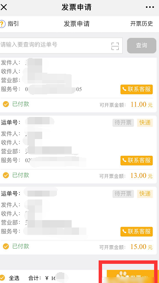 2、点击发票申请后在发票申请主页勾选需要开发票的项目,勾选完毕后点击右下角的【申请发票】,如图所示!