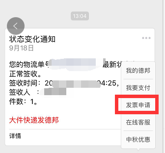 1、关注德邦快递官方微信公众号,绑定寄件或收件使用的手机号。点击公众号主页下方的【我】,在弹出来的对话框中点击【发票申请】如图所示!