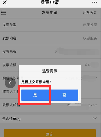 5、点击确定后,系统会弹出一个对话框问你是否提交开票申请,注意点击【是】,如图所示!