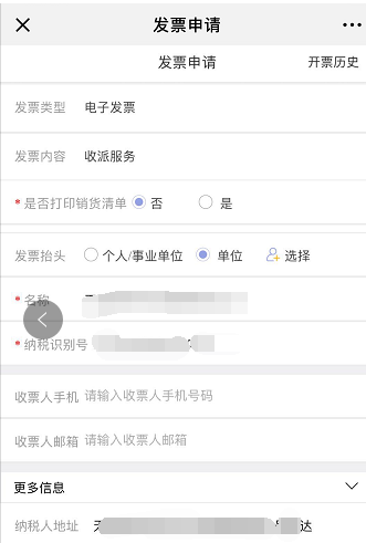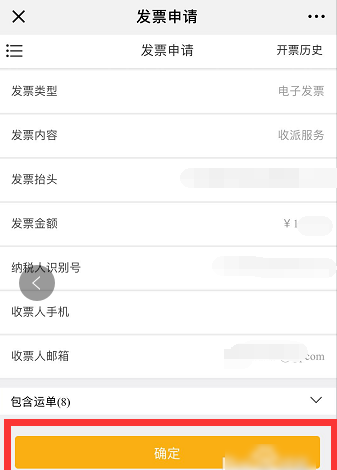 3、点击申请发票后,页面会跳转到填写开票信息的页面。认真填写开票信息(一定要填接收方式,手机号或者邮箱一定要至少填一个,推荐填邮箱),再三检查注意不要填错了,填错了影响报销。信息检查无误后,点击下面最下方的黄色按钮进行确认。