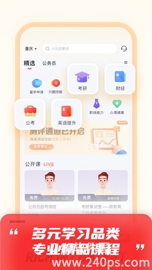 高途app下载安装2023官方版是一款非常优质的在线教育学习软件,致力于为3-18年龄的孩子们带来更高品质的教学产品和服务课程,让孩子们能够对学习产生兴趣,更好地投入到学习之中去。有了高途app下载安装2023官方版这款软件,我们就不再需要去上昂贵的线下辅导班了,这里有着一众名师任你挑选,提供直播授课,在线课堂给予你良好的学习环境,有什么问题都可以在线提出帮助你解决,还有详细的解题思路帮助你更好地规划呢。另外,在这款软件内还支持用户们在线搜题,只需要拍一拍便能够立马呈现答案啦。