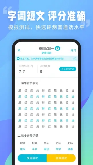 普通话测试功能,纠正发音巩固练习,提高普通话学习效率。
