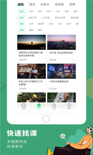 提供2000多集来自世界一流名校的优秀视频课程,涵盖人文、哲学、数学、心理学、经济学等领域。视频播放速度流畅,视频画面高清。