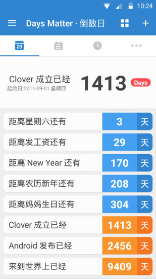 倒数日app安卓是一个帮你记住重要日期的工具。让你不再忘记重要的日子,超级强大的小组件,随时查看重要日期的时间,纪念日,工作,生活,生日等等都可以记录下来。让此款软件帮你记得,查看已经过去多少天,从哪一年哪个月哪一天开始到目前为止已经过去多少天都会显示出来。用户增加时间直接填写标题,日期,分类,可以放置封面哦,封面主题自己选择,倒数日app安卓支持设置重复日期,以及备注信息,页面超级简洁大方,一目了然,多套主题任你选择,支持本地和在线云备份,保护你的数据,数据不会再丢失,也可以记录周期性的日子哟,可以选择年,月,日三种周期类型,每次日子到期的前一天就会提醒用户,还有万年历功能哦,节假日,休息补班都可以查看得到哦,超级实用方便,内存超小,不占空间,人手必备的软件,快来下载吧。