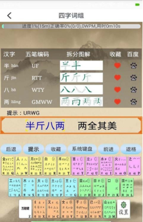 2、五笔打字练习;本软件可以让你在手机上就可以练习五笔打字,并按难易等级,分字根练习,二、三级简码和词组的练习,让您由易入难,练习得心应手,并且支持横竖屏切换,方便用户打字。