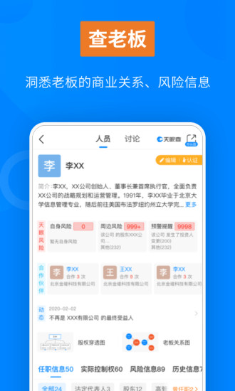 天眼一下----让查人变得更简单,查公司变得更快捷。 查企业、查老板、查关系,查征信、查信用、找客户、谈合作、做调研,就上天眼查! 目标人物关系网任意查,想知道的公司信息随便找,百余种数据维度等你看。 关系梳理透明化,专业信用报告呈现等高阶功能,明星和老板们都在用,适用于所有人群。 天眼查实时洞察商业讯息,成功人士都在用的商业安全工具,下载天眼查APP免费查询。