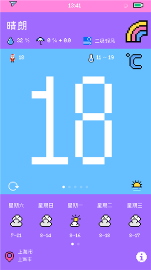像素天气安卓版是一款天气预报软件,在应用软件的界面,我们会发现整个应用软件设置的非常清晰,类别分类放置的也很明确。整个应用软件的画面色彩非常丰富,粉色,蓝色紫色的配对,给人不一样的视觉感受,两个界面简洁清新,又不是可爱与个性,整个软件的天气预报功能非常多样,用腻了自带的天气软件不妨试一试试这样一款萌萌哒又小清新的江天气预报软件吧,不会让你失望,快来下载体验吧!