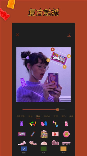 2、超多个性复古贴纸可选择,还有质感滤镜尽情体验;