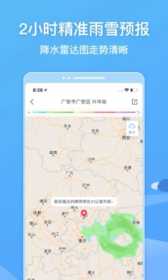 降水雷达图走势清晰,提供分钟级精准天气预报,出行更放心。