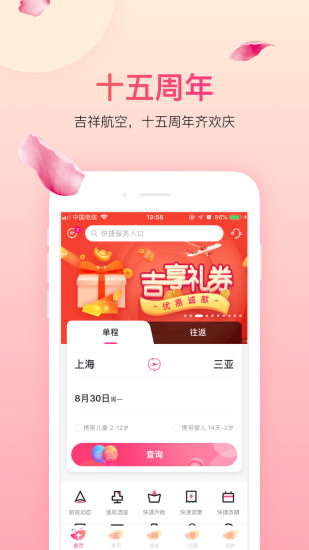 吉祥航空客户端是一款航空服务非常周到的手机软件,吉祥航空客户端这款软件不仅可以让你买到机票,开通软件会员的话还可以有更多的优惠可以体验,超棒的服务让所有的用户都非常满意,这款软件已经服务市民们很多年,只要你需要的航班信息都可以给你提供,买票什么的就更方便了!如果你需要这样的出行服务软件可以马上来下载吉祥航空客户端!