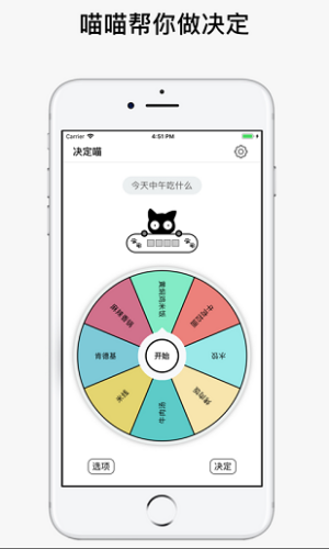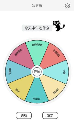 决定喵最新版本是一款能够快速帮助用户做出决定的手机软件,当你在日常中面临选择困难的时候,这款软件就可以快速帮助你做出选择。不管是吃什么,做家务等,你也可以自定义轮盘的内容,转动到哪一格就是哪一格,轻松帮你做出决定,再也不怕选择困难了。