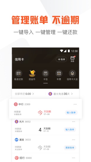 51信用卡管家app是国内针对众多信用卡持有人开发的一款信用卡掌上管理手机软件。51信用卡管家app集合了市面上几十家大中型银行各类信用卡为一体为用户管理信用卡带来科学服务。用户通过51信用卡管家app可以绑定任意一家平台合作银行的信用卡,然后通过平台进行统一的管理。51信用卡管家app为用户推出了还款提醒功能,确保您的账单不逾期。此外,51信用卡管家app还统一收录了不同银行信用卡的优惠信息方便用户可以手机在线办卡,最快的当天便可出卡。有需要的朋友快来下载体验吧。