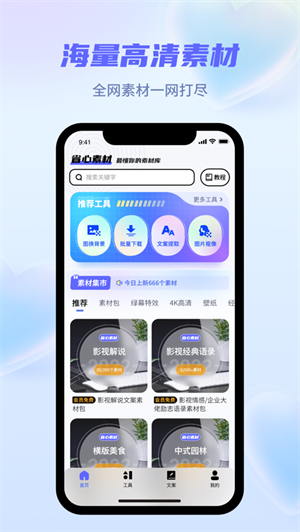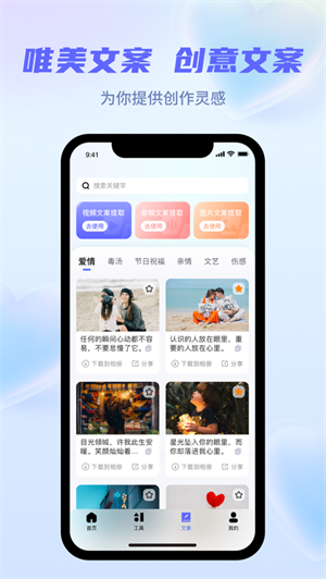 省心素材app官方版是一款功能强大的素材软件,软件中有着海量的素材资源,用户可以在软件中来寻找自己需要的素材。平时我们下载各种的视频,视频上面都会有着各种的水印,之前用户需要花费各种的办法来去除水印,现在有了这个软件玩家只需要把视频导入软件中就等待一会就可以去除水印。软件还支持MD5尊享,还有着实用的语音转文字等创造工具,用户可以无限打字就可以进行文字创作,软件中还着丰富的唯美文案,用户搭配上素材和文案来发一条唯美的朋友圈。