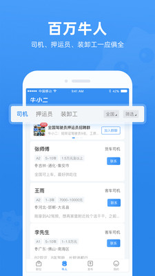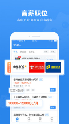 牛小二招聘app这是一款专门为司机求职招聘量身定做的效率办公app,快速找到工作机会,专注于物流蓝领的招聘。找工作直接跟老板联系,无需写丰富的简历,意向职位直接跟老板联系,方便求职更通畅,满足了蓝领司机找工作的需求。提供海量高薪职位,高薪名企离家近不再是梦想,应有尽有,每日实时更新,有几十万雇主在线招聘。百万牛人齐聚,司机、押运员、装卸工一应俱全,寻找赏识的雇主老板。勇敢对虚假信息说声不,人工审核、AI实时监控,收获用户举报、查看行业黑名单等等,虚假信息无处隐藏,一键拉进黑名单,不再受用。快来下载牛小二招聘app,寻求赏识你这匹千里马的伯乐。