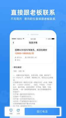 2、找工作,不用写复杂的简历,不用等待雇主回应,直接电话联系老板,更高效、更适合卡友群体。